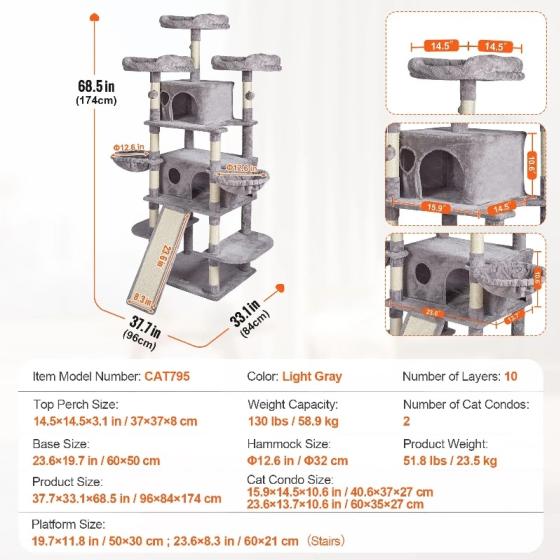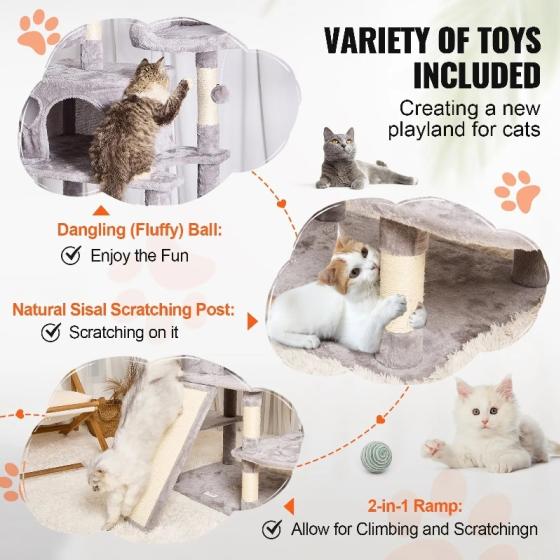 Уютен рай за котките: Кулата за котки разполага с 2 просторни котешки апартамента, 3 горни кацалки и 2 хамака, осигуряващи лична и сигурна среда за почивка. Има множество платформи, където котките могат свободно да избират къде да играят и да си почиват. Меките плюшени повърхности са нежни към кожата и ноктите на котките, осигурявайки комфортно изживяване при почивка.