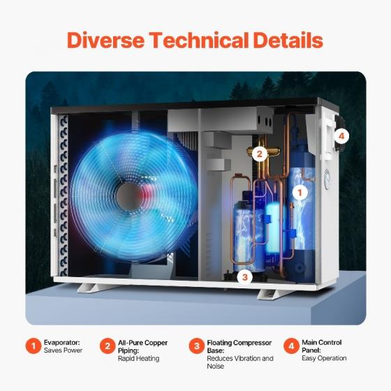 Контрол на температурата: Предлагайки опции за отопление и охлаждане, този нагревател за басейн лесно поддържа желаната температура. Независимо дали през горещо лято или студена зима, насладете се на идеални условия за плуване и подобрен комфорт без проблеми с температурата.