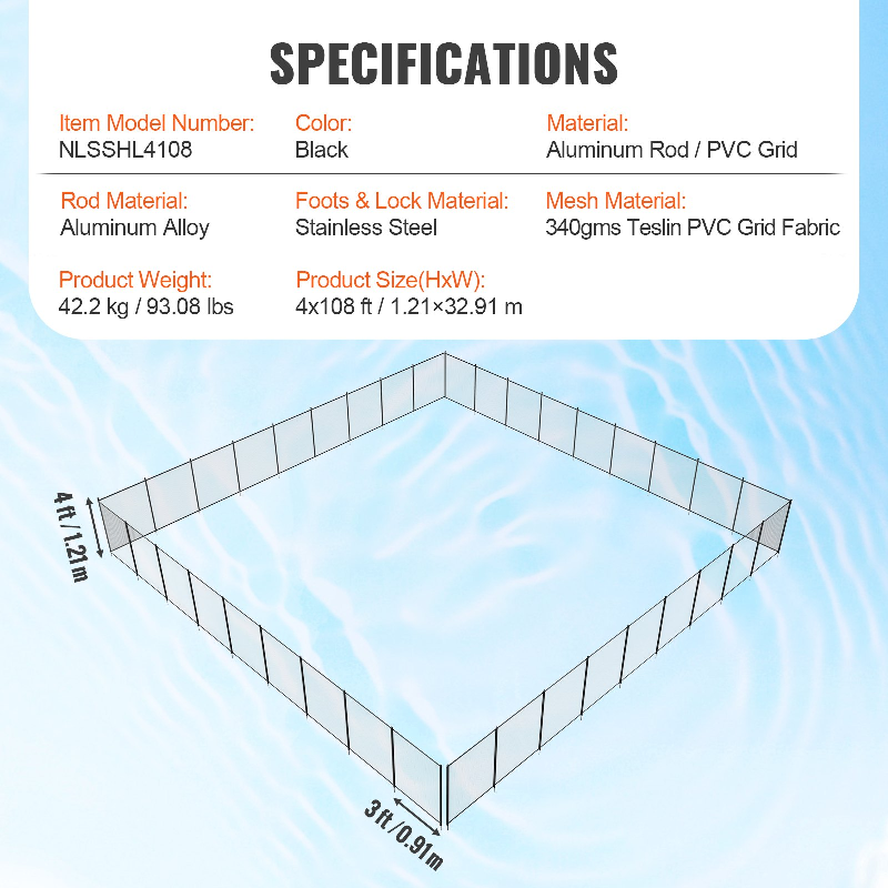 Пълна защита: Нашата ограда за басейн с размери 1.21 x 32.91 м / 1.21 x 29.26 м / 1.21 x 32.91 м предлага гъвкав монтаж за различни форми и размери на басейни, особено за големи басейни. Той не само гарантира безопасността на басейна, но също така ефективно защитава домашни любимци и деца, служейки като пазител на вашето семейство.