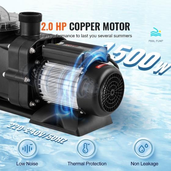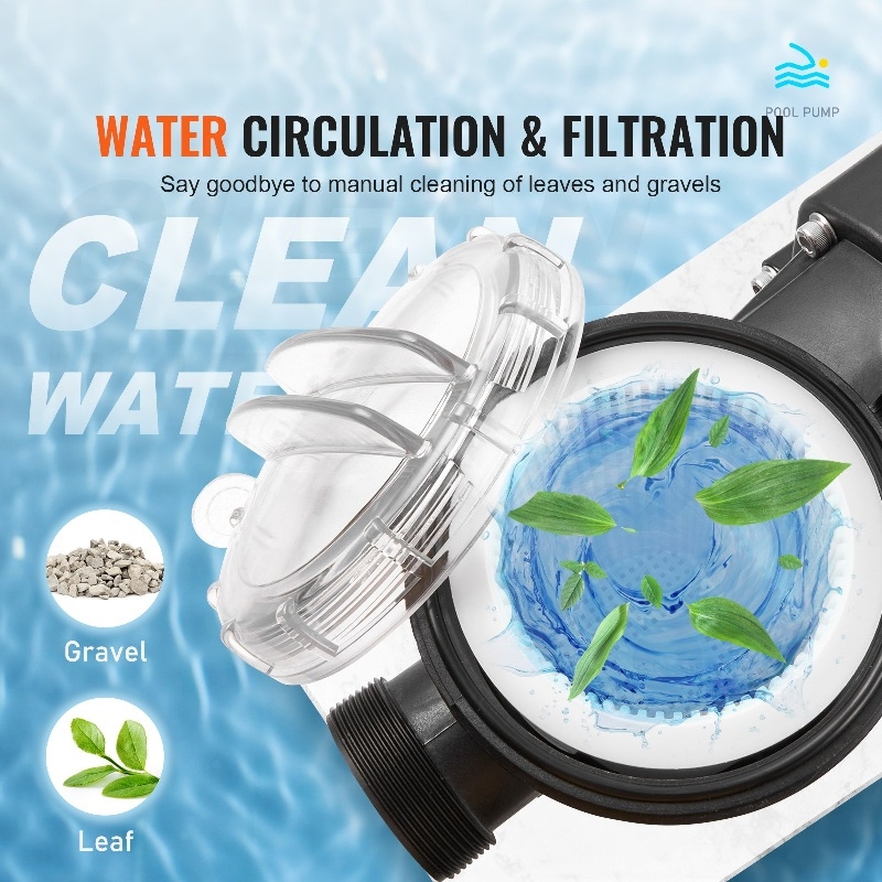 ЗАЩИТА ОТ ТЕРМИЧНО ПРЕНАТРЕВЯВАНЕ - Помпата за басейн с мощност 2 HP е плътно затворена, без течове и има вградена защита от термично претоварване, която предпазва от прегряване и повреда, за да се гарантира сигурността.