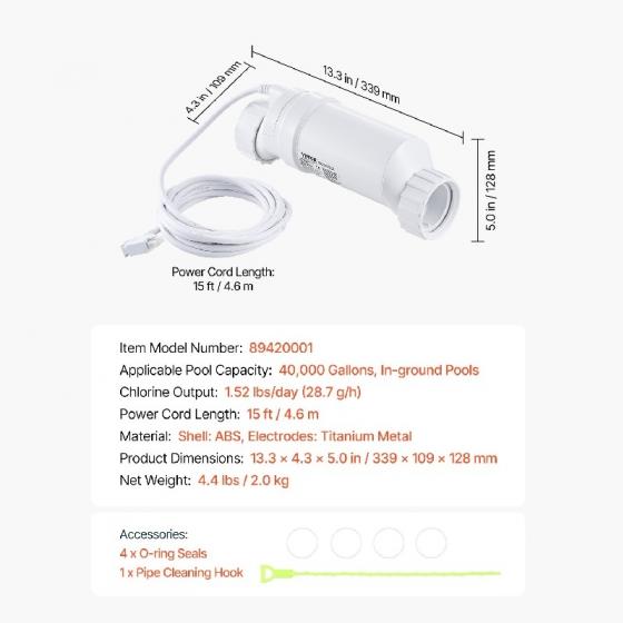 Високоефективно пречистване: Нашият хлоратор за басейни със солена вода може да произвежда до 8.7 г/ч, идеален за басейни до 150 куб.м. С висококачествени титаниеви плочи и здрав ABS корпус, той е създаден да издържи и да е устойчив на корозия, удължавайки живота на оборудването на вашия басейн.