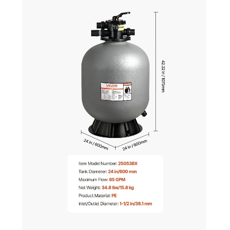 Лесна поддръжка и монтаж: Проектиран за лесна поддръжка, пясъчният филтър за вкопан басейн включва дренажна тапа, която забавя водния поток, за да се избегне замръзване и да се опрости зимната поддръжка. Входните и изходните фитинги с диаметър 1-1/2 инча правят монтажа изключително лесен.