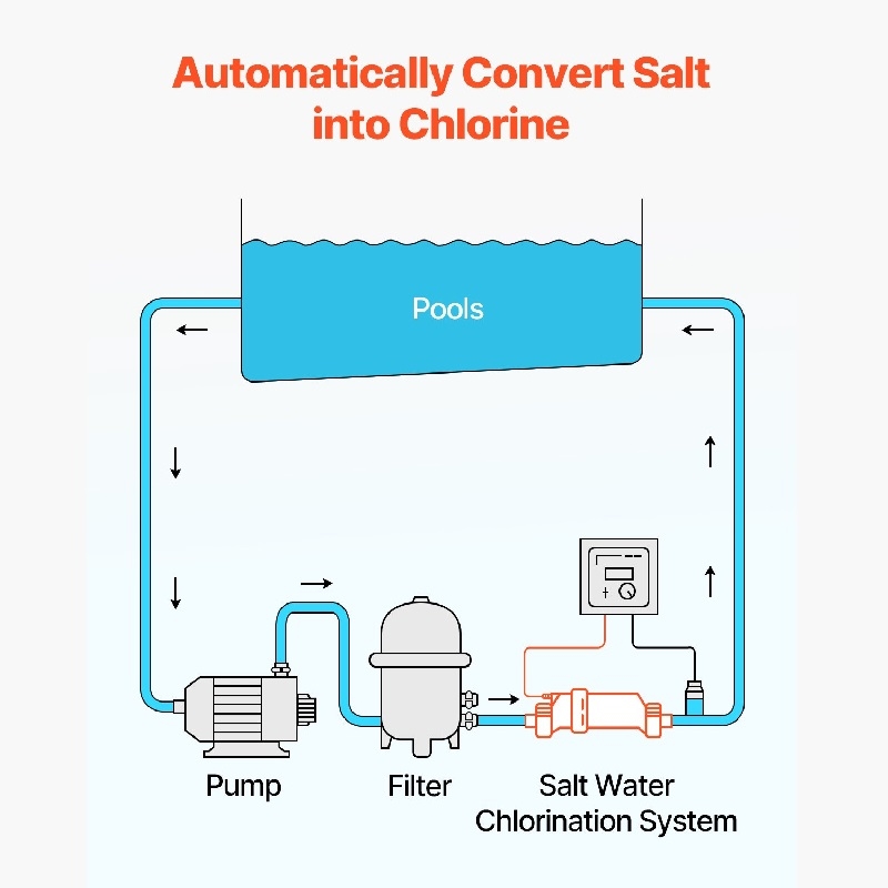 Лесна поддръжка на водата в басейна: Използвайки усъвършенствана електролитна технология, системата за хлориране на сол в басейна генерира хлор от сол и титан, елиминирайки нуждата от скъпи хлорни таблетки. Кажете сбогом на дразненето на очите и неприятните миризми от традиционните хлорни басейни, докато се наслаждавате на по-нежно плуване.