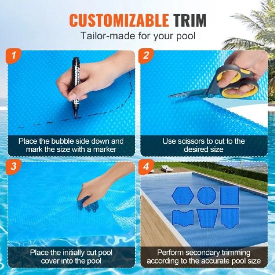 Намалява загубата от изпарение: Дизайнът със затворени мехурчета на нашето соларно покритие с различни размери. Предотвратява до 95% от изпарението на водата. Дебелият PE материал също така ефективно изолира водата, спестявайки ценни водни ресурси.
