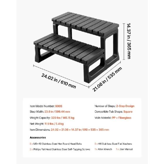 Размери за квадратни вани: Нашите външни стълби са специално изработени, за да стоят плътно до квадратните вани, с размери 610 x 535 x 365 мм, така че стъпалото на вашето джакузи приляга плътно към квадратните вани за по-лесно влизане. Настанете се плътно за минути.