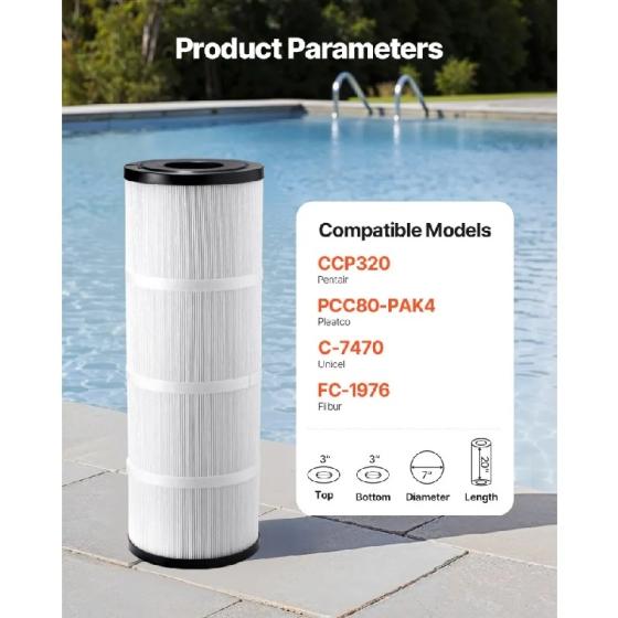 Съвместими модели за замяна: Филтърът за вода за басейн GL-320-1 е съвместим със следните модели: VEVOR GL-320-1, Pentair CCP320, Pleatco PCC80-PAK4, Ultraf-A5, Unicel C-7470, R173573, Filbur FC-1976, 178580, 817-0081. Забележка: Това е съвместим аксесоар от трета страна. Посочените марки и модели са само за справка. VEVOR е независима марка.