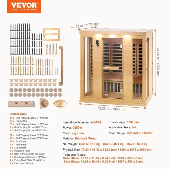 Инфрачервена дървена сауна Vevor, 2580 W, за дома и СПА центрове, за 4 човека