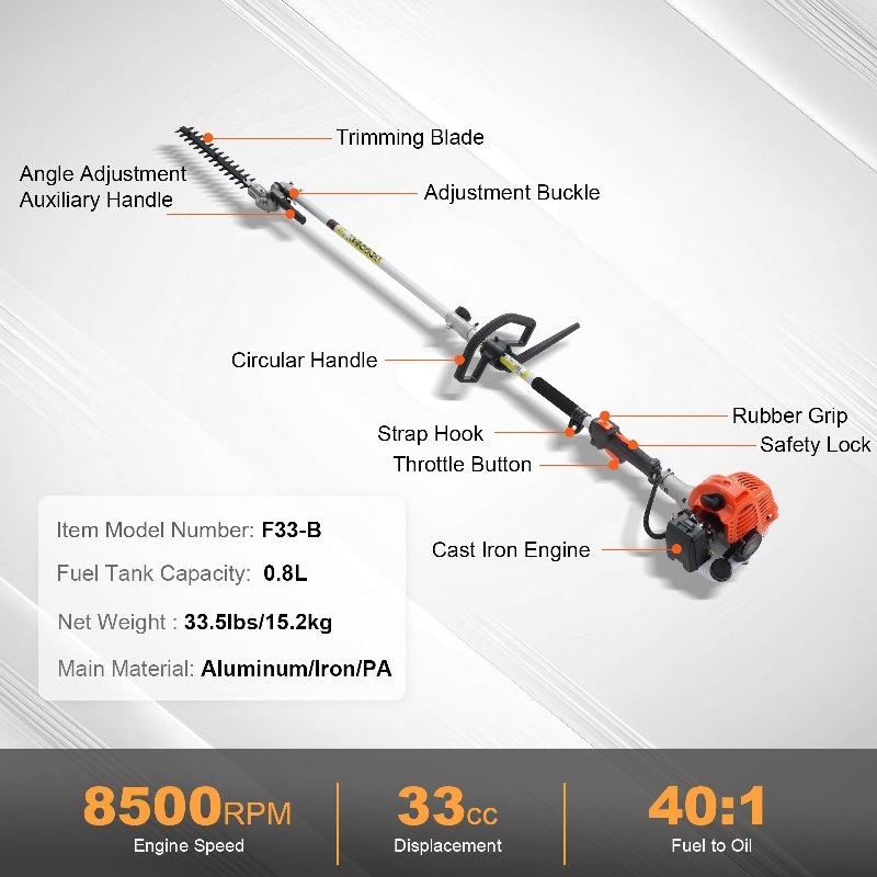 Ефективно подрязване на жив плет: Отличаващ се с мощен 2-тактов двигател с работен обем 33CC и скорост 8500 RPM, този бензинов тример за жив плет осигурява стабилна производителност. Скоростта на острието достига до 6500 RPM, осигурявайки рязко и ефективно подстригване. Идеален е за бързо подрязване на високи клони, храсти, чаени градини и поддръжка на ландшафта.