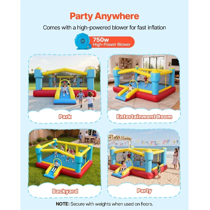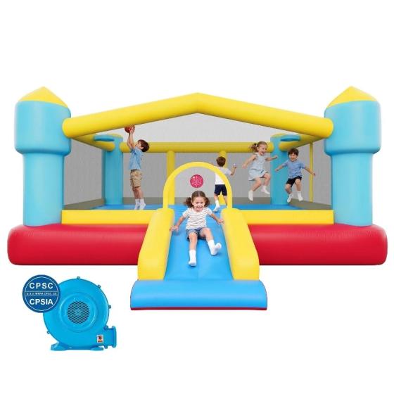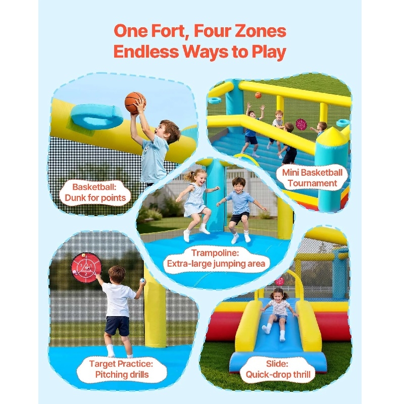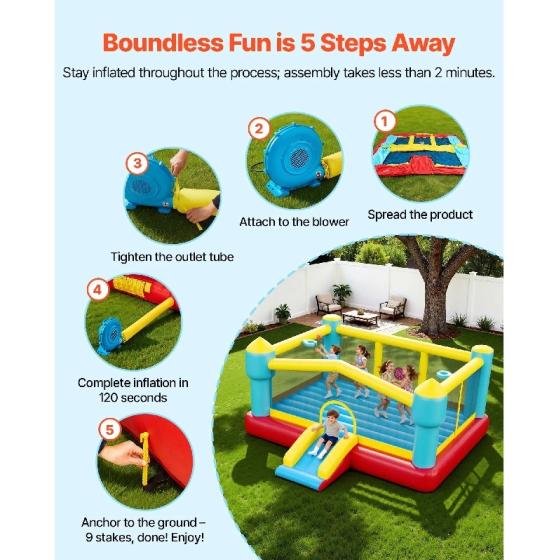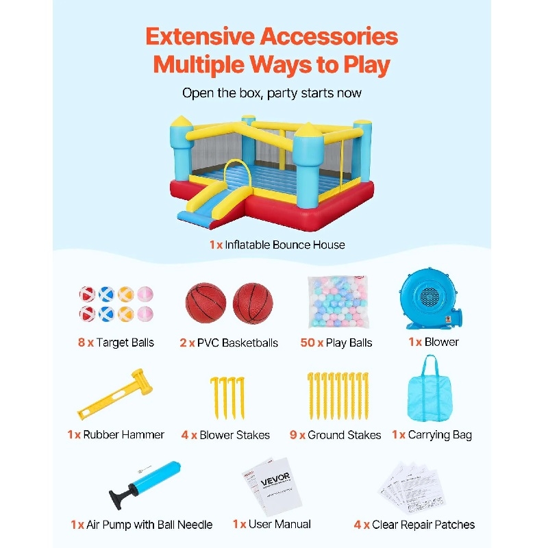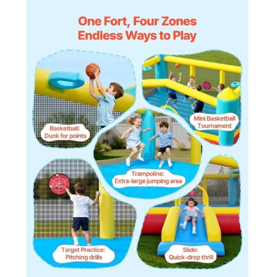 Създаден за игра: Проектиран с голяма зона за отскачане и пързалка, нашият надуваем замък предлага разнообразни занимания за деца и семейства, на които да се забавляват заедно. Безплатната мишена добавя интерактивна игра с хвърляне за групова игра. Пакетът включва 8 топки за мишени, 2 PVC баскетболни топки и 50 топки за игра.