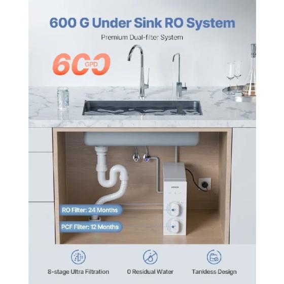 Пречиствателна система на вода Vevor, 2271 литра на ден, 8-степенен безрезервоарен филтър за обратна осмоза, сертифициран от NSF, за намаляване TDS