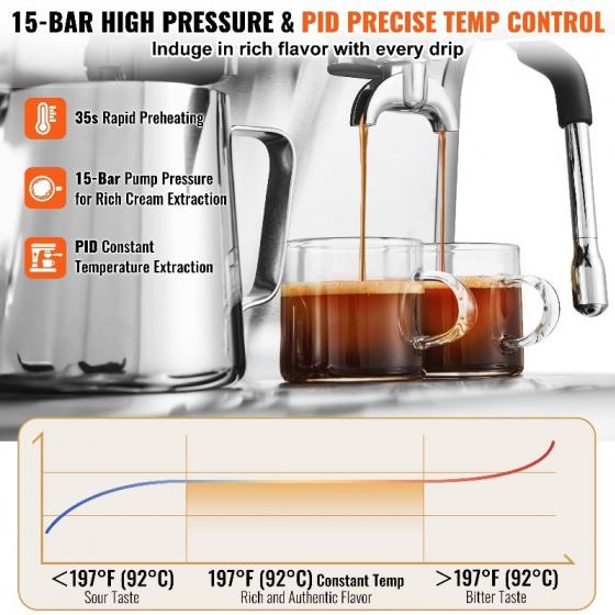 Приготвяне под високо налягане: Подобрете кафето си с еспресо машината с високо налягане от 15 бара, приготвяйки висококачествено кафе, пълно със златно масло, за да подобрите аромата и наситеността. Бързото 35-секундно предварително загряване и прецизният PID контрол на температурата поддържат температурата на водата на оптимални 92℃ (197℉), осигурявайки богат и автентичен вкус.