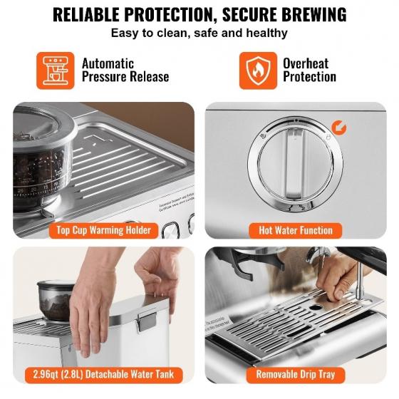 Безопасен и обмислен дизайн: Високата безопасност е приоритет с автоматично освобождаване на налягането и защита от сухо нагряване. Подвижният резервоар за вода с голям капацитет от 2.96qt / 2.8L ви спестява нуждата от често пълнене; подвижната тава за капки прави почистването лесно, а функцията за отстраняване на котлен камък удължава живота на машината за дългосрочна надеждност.