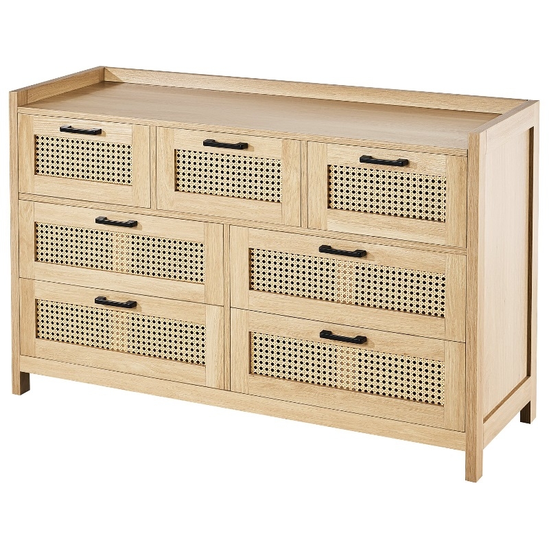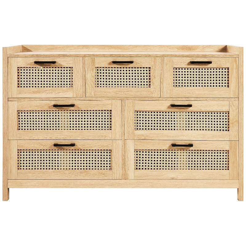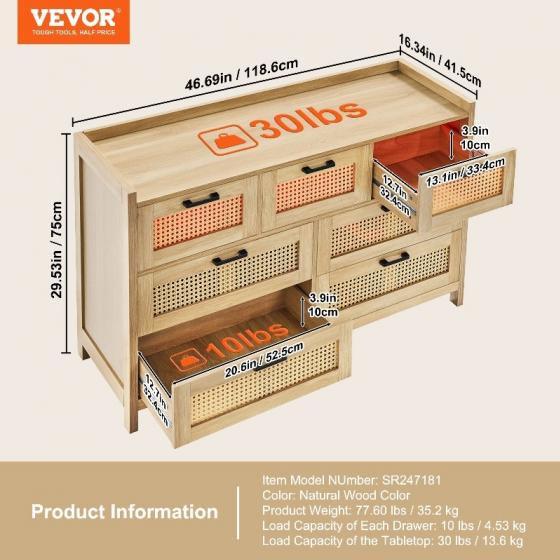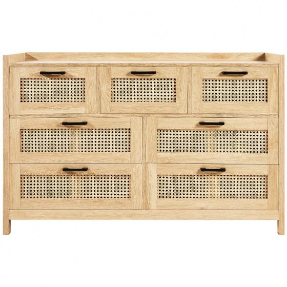 Голям капацитет за съхранение: Този скрин от ратан разполага със седем просторни чекмеджета, идеални за организиране на вашето пространство. Независимо дали във вашата спалня, всекидневна или коридор, това е шикозно допълнение, което побира до 5 кг на чекмедже и 13.6 кг отгоре - идеално за ежедневна употреба.