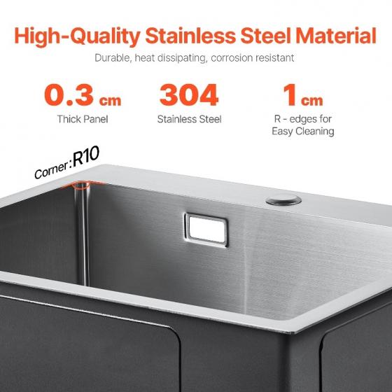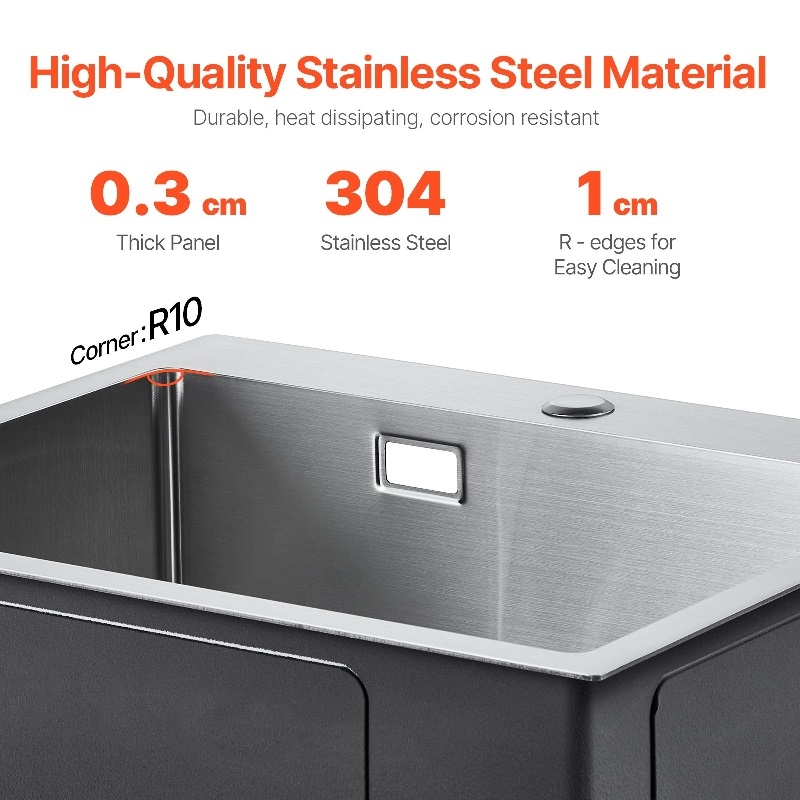 Стабилна неръждаема стомана: Тази работна станция за кухненска мивка е изработена от висококачествена неръждаема стомана 304 осигуряваща издръжливост, устойчивост на ръжда и лесно почистване. Избягвайте остри предмети, за да предотвратите повърхностни драскотини. Модернизираната дебелина на панела е 3 mm, 50% по-дебела от повечето стандартни кухненски мивки. Той разполага със заоблени ъгли R10° за лесно почистване и модерна естетика.