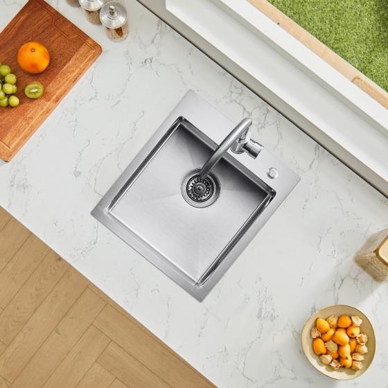 Лесен монтаж отгоре: Нашата мивка от неръждаема стомана не изисква големи модификации на вашите кухненски шкафове или плот. Изключително дебелият 3 мм ръб от неръждаема стомана 304 позволява сигурен монтаж отгоре, а дебелото тяло на мивката гарантира издръжливост.