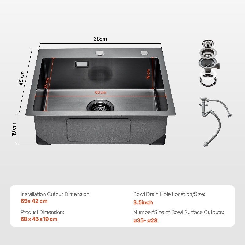Голям капацитет: Външен размер на мивката: 40x45, 55х45 или 68х45 см. Вътрешен размер: 37х42, 52x42 или 65x42 см. Дълбочина на купата: 19 см. Този кухненски умивалник е достатъчно дълбок, за да побере чаши, тенджери и тави за печене, отговаряйки на различни нужди за миене.