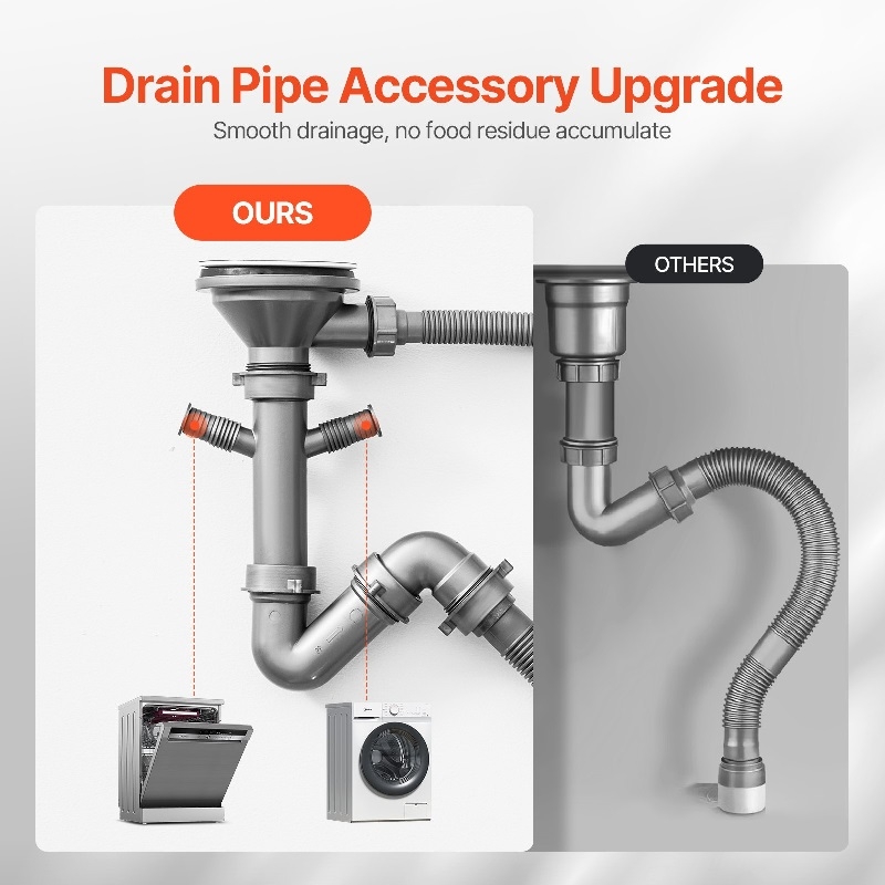 Система за бързо оттичане: Тази подготвителна мивка с щанга разполага с X-образен дренажен дизайн в долната част, оборудван с дренажен комплект за осигуряване на бързо оттичане и предотвратяване на натрупването на вода. Той също така включва страничен отвор за оттичане и два интерфейса за водопроводни тръби за свързване на съдомиялни машини, което позволява гладко оттичане без натрупване на остатъци от храна.