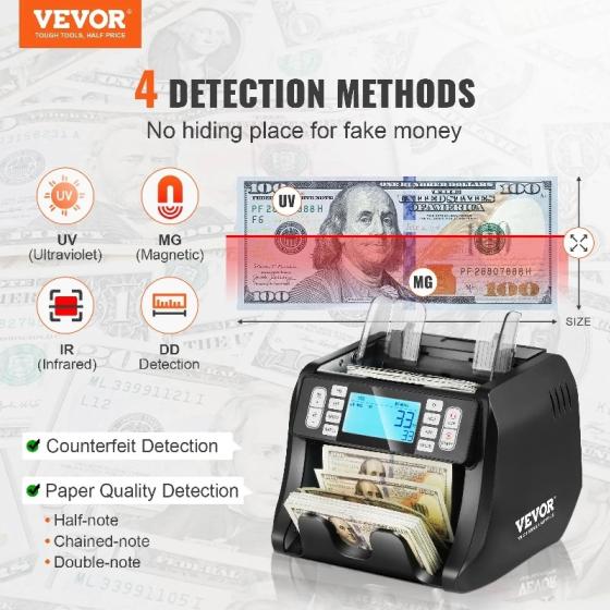 Надеждна бизнес защита: Броячът на пари VEVOR осигурява максимална сигурност с четирите си метода за откриване на фалшификати: UV, MG, IR и DD. Той сканира точно банкнотите за автентичност и има функции като автоматично откриване на половин банкнота, верижна банкнота и двойна банкнота. С тази машина за брояч на пари не е нужно да се притеснявате за фалшиви банкноти, което ви дава спокойствие, докато се справяте с тежка работа по броене на пари в брой.