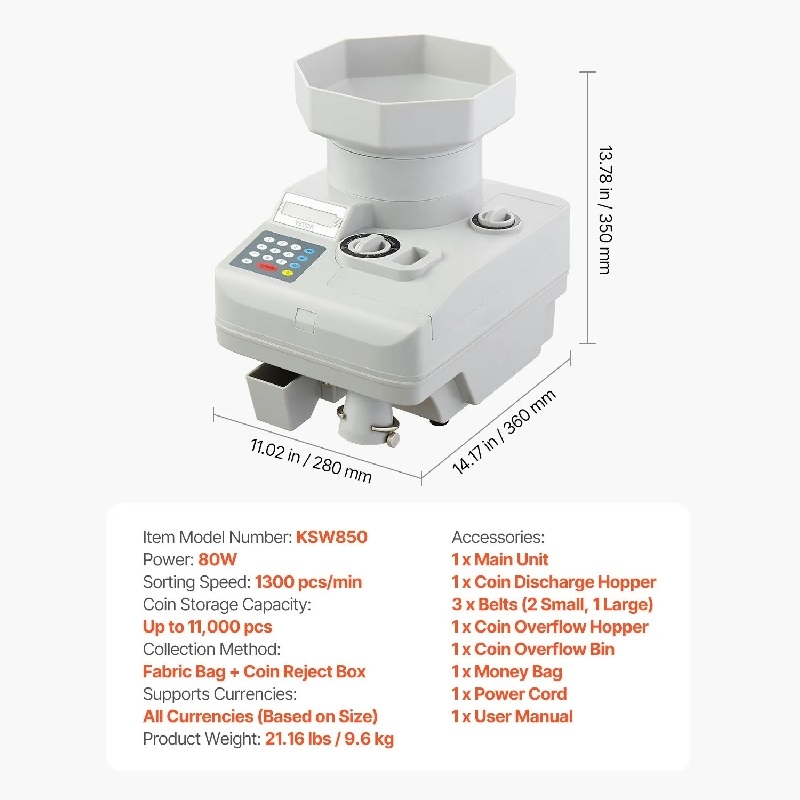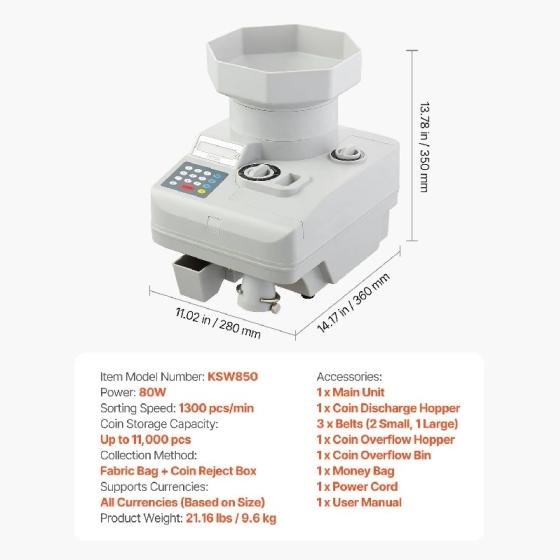 Дизайн с голям капацитет: Можете да разчитате на нашия сортировач на монети, за да се справи с досадните задачи за броене на монети. С дизайна си с голям капацитет, той може да побере до 11 000 монети, което значително намалява нуждата от често изпразване. Тази функция прави работата ви по-ефективна и удобна.