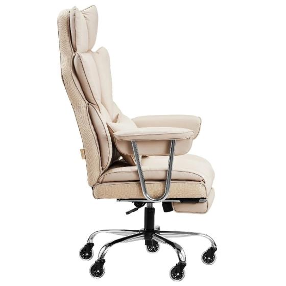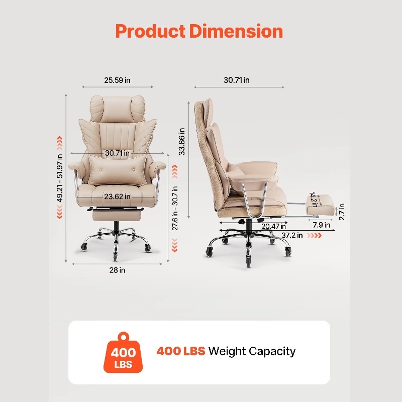 Ергономичен комфорт: Високата облегалка и ергономичният контур на гръбначния стълб на този стол с висока облегалка осигуряват опората, от която се нуждае гърбът ви, за да остане отпуснат през целия ден. Меката възглавница от пяна с висока плътност, комбинирана с първокласна кожа, създава усещане за сядане на удобен диван, независимо дали работите или си почивате.