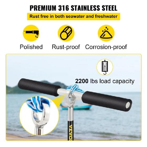 Висококачествена неръждаема стомана: Котвата за пясъчен насип е изработена от висококачествена неръждаема стомана 316, което я предпазва от ръжда в морска и сладка вода. Освен атрактивния си полиран външен вид, тя има и товароносимост от 2200 фунта (1024 кг).