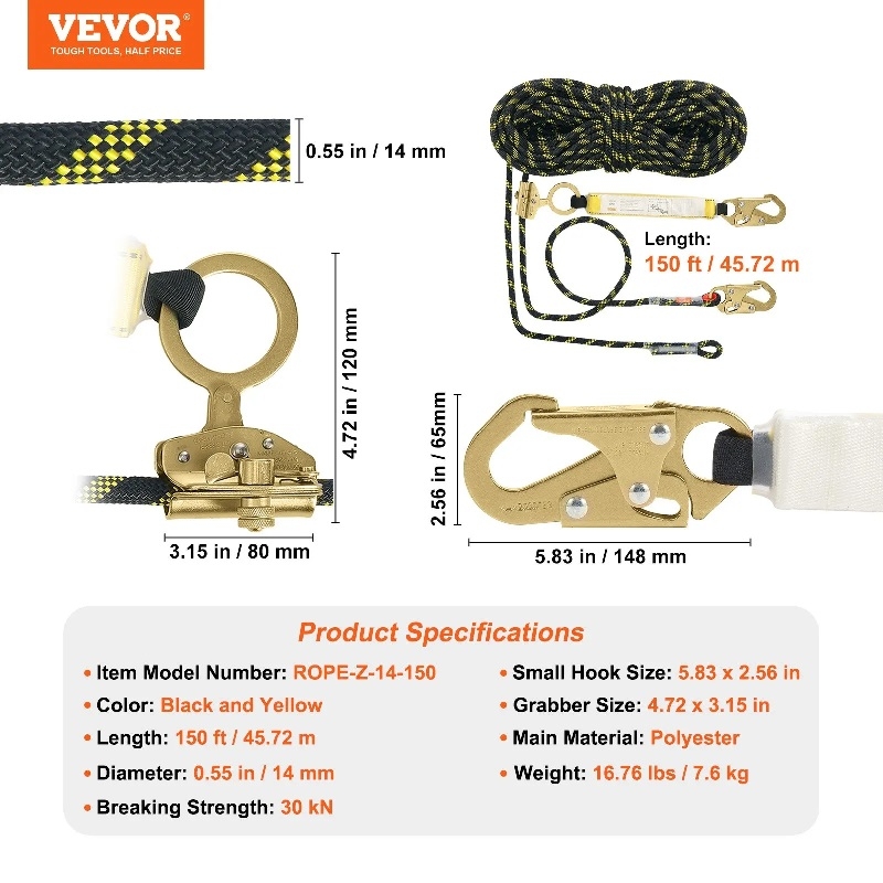 Спасително въже с дължина 45 метра: Обезопасете работата си на височина с вертикалното спасително въже VEVOR. Това спасително въже с дължина 45 метра се отличава с издръжлив диаметър 0,55 инча (14 мм) и стабилна якост на скъсване от 30 kn, отговаря на стандартите ANSI и осигурява защита при падане. Задължителен инструмент за хора, които трябва да работят на високи места.