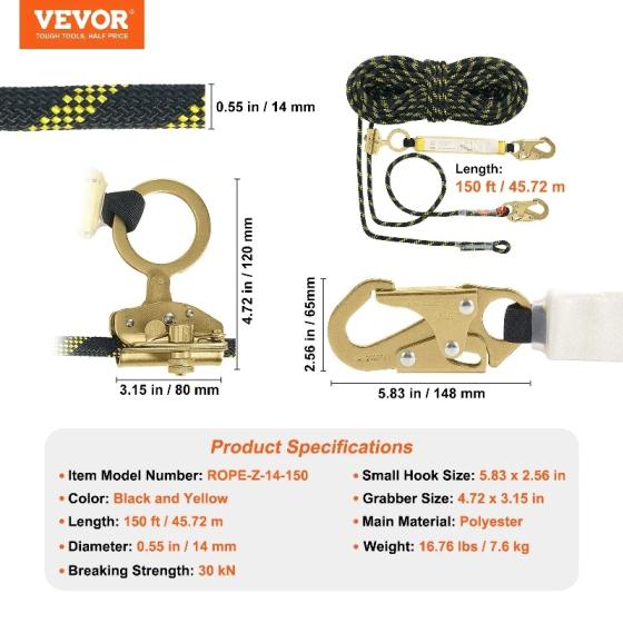 Стоманени карабинки и захващащо въже: Нашето спасително въже е снабдено с две стоманени карабинки с якост на скъсване 23 KN/5174 lbs, осигуряващи сигурна връзка с вашето защитно оборудване, като например предпазен колан и D-образни анкерни пръстени. Освен това, регулируемото захващащо въже, със якост на скъсване 12 KN/2698 lbs, позволява безпроблемно движение по спасителното въже, осигурявайки лесна употреба.