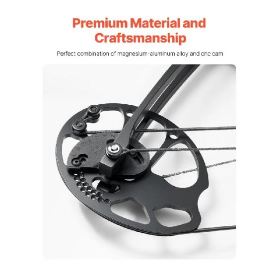 Висококачествен и издръжлив материал: Корпусът на сложния лък е изработен от комбинация от магнезиево-алуминиева сплав и CNC обработени ексцентрикови материали, което го прави здрав и устойчив на износване. Лъкът е лесен за опъване и продължава да се представя отлично.